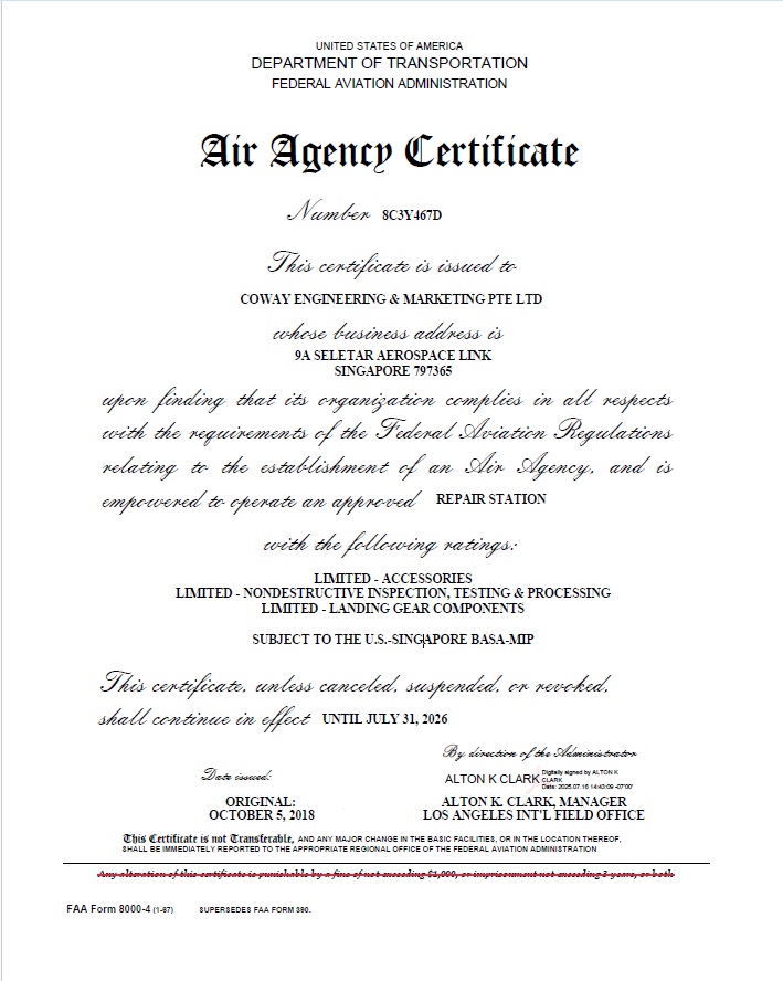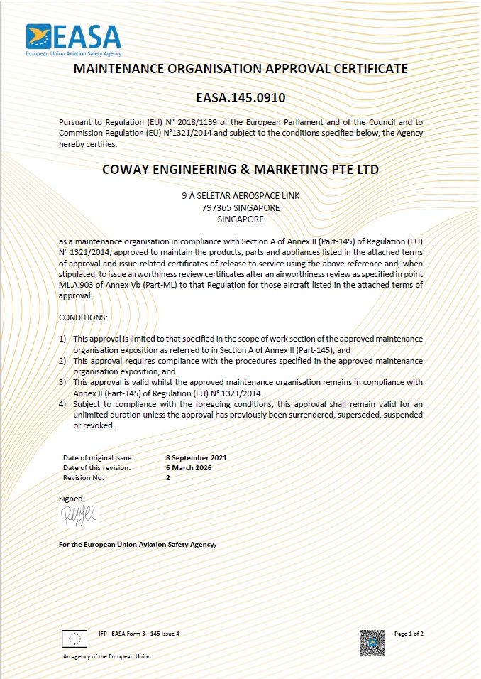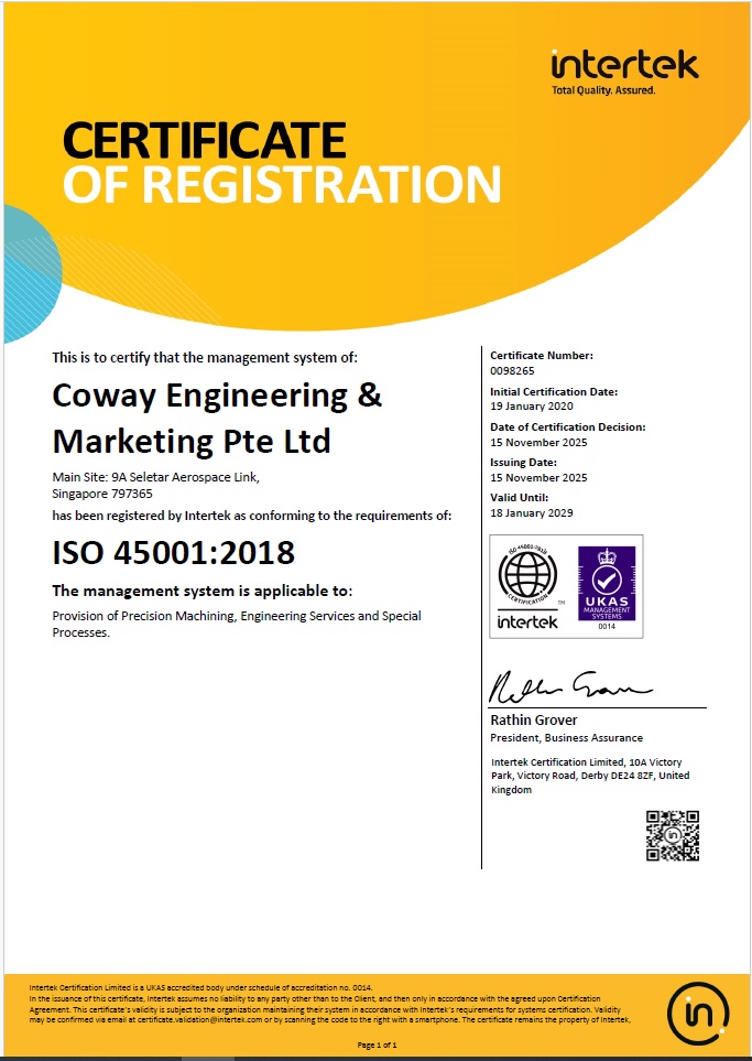 Founded by Local Entrepreneurs, Coway Engineering & Marketing Pte Ltd was established in 1996, and incorporated in 1999, with an early intention to be a niche Supplier for the Aerospace Industries. We have since expanded and progressed to the manufacturing of challenging Oil & Gas Components, Aerospace Article, and carry out MRO for Aerospace Components.
